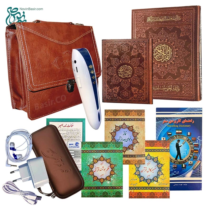 این بسته کامل ترین و پرفروشترین بسته قلم قرآنی بصیر که به صورت ویژه توسط موسسه فرهنگی و قرآنی بصیر عرضه می گردد .این بسته همراه با قرآن وزیری کاملا رنگی (604 صفحه) دارای ترجمه فارسی زیر، کتاب منتخب مفاتیح درشت خط، سه عدد دفترچه امکانات و راهنما و با کاملترین امکانات همراه با کیف طرح چرم، با قلم هوشمند با کیفیت بسیار عالی و قابلیت به روز رسانی و استفاده از جدیدترین کتاب های تولید شده توسط موسسه بصیر گامی جدیددر نسل قلم های هوشمند نهاد. این بسته از هر لحاظ مورد تائید شرکت بصیر است و نسبت به بسته های مشابه امکانات عالی و بی نظیر است که توسط این موسسه با قیمتی مناسب و پشتیبانی عالی توزیع می گردد.