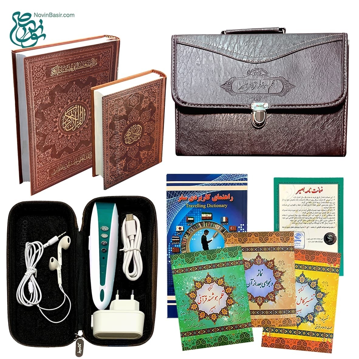 این بسته کامل ترین و پرفروشترین بسته قلم قرآنی بصیر که به صورت ویژه توسط موسسه فرهنگی و قرآنی بصیر عرضه می گردد .این بسته همراه با قرآن وزیری کاملا رنگی (604 صفحه) دارای ترجمه فارسی زیر، کتاب منتخب مفاتیح درشت خط، سه عدد دفترچه امکانات و راهنما و با کاملترین امکانات همراه با کیف طرح چرم، با قلم هوشمند با کیفیت بسیار عالی و قابلیت به روز رسانی و استفاده از جدیدترین کتاب های تولید شده توسط موسسه بصیر گامی جدیددر نسل قلم های هوشمند نهاد. این بسته از هر لحاظ مورد تائید شرکت بصیر است و نسبت به بسته های مشابه امکانات عالی و بی نظیر است که توسط این موسسه با قیمتی مناسب و پشتیبانی عالی توزیع می گردد.