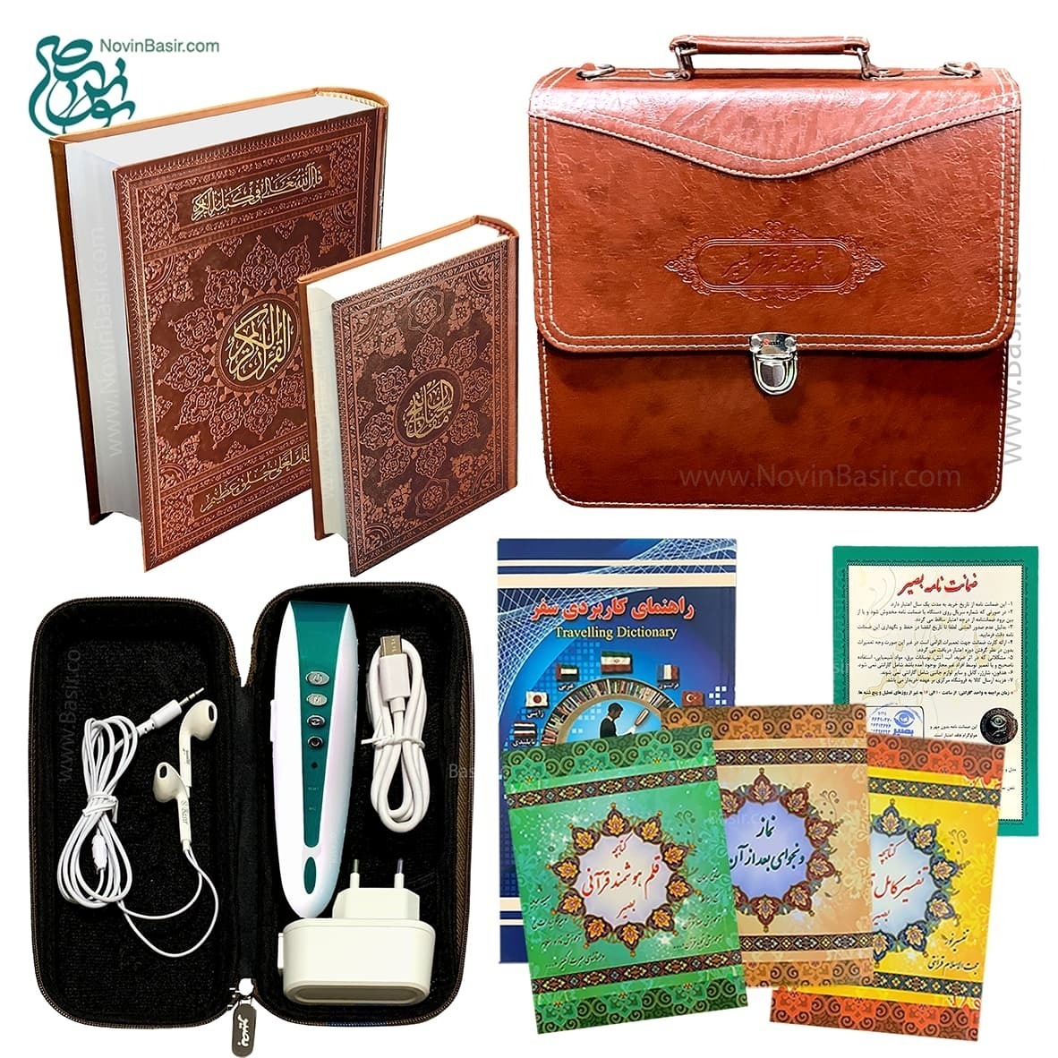 کامل ترین و آخرین بسته قلم قرآنی بصیر با امکانات عالی و بی نظیر که به صورت ویژه توسط این مرکز عرضه می گردد .این بسته همراه با قرآن وزیری بسیار درشت خط (1208 صفحه ای و درشت خط ترین کتاب ویژه قلم هوشمند قرآنی) دارای ترجمه فارسی زیر، کتاب منتخب مفاتیح درشت خط، دفترچه های گوناگون و کاملترین امکانات همراه با کیف طرح چرم با قلم هوشمند با کیفیت بسیار عالی و قابلیت به روز رسانی و با قابلیت استفاده از جدیدترین کتاب های تولید شده توسط موسسه بصیر گامی جدید در نسل قلم های هوشمند نهاد. این بسته از هر لحاظ مورد تائید شرکت بصیر است و نسبت به بسته های مشابه دارای کیفیت و امکانات عالی و بی نظیر است که توسط این موسسه با قیمتی مناسب و پشتیبانی عالی توزیع می گردد. همچنین مجوز سازمان دارالقرآن جمهوری اسلامی ایران در انتهای کتاب قرآن این بسته چاپ شده و قلم قرآنی دارای کیفیت عالی با یک سال گارانتی تعویض و سه سال خدمات پس از فروش می باشد.