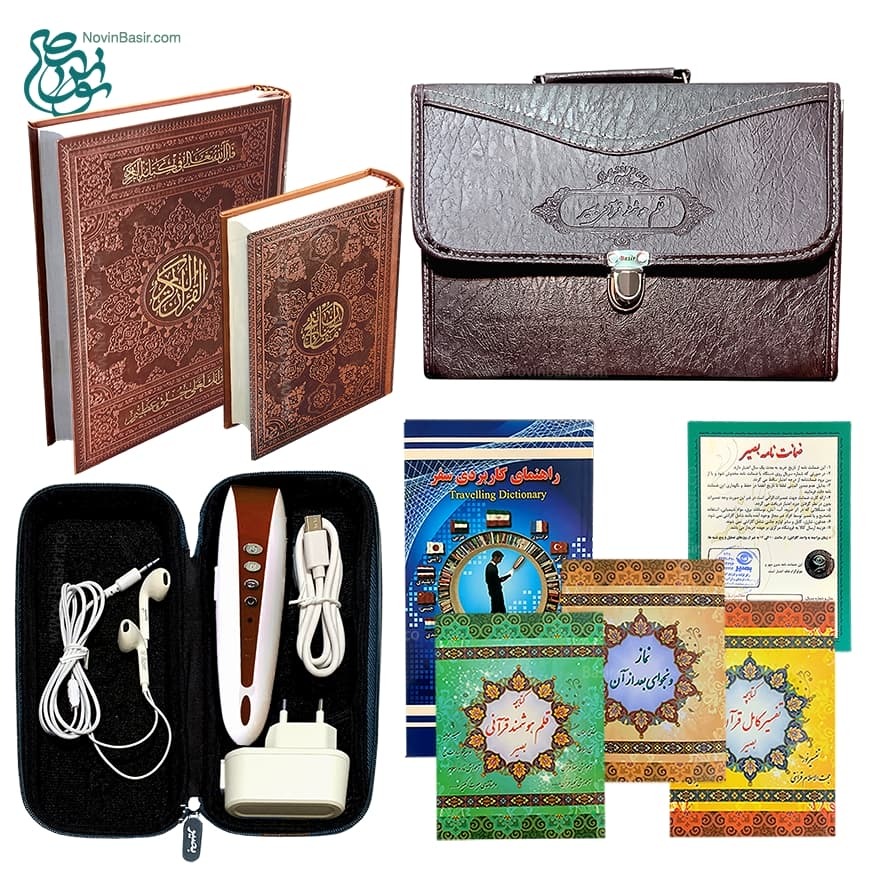 این بسته کامل ترین و پرفروشترین بسته قلم قرآنی بصیر که به صورت ویژه توسط موسسه فرهنگی و قرآنی بصیر عرضه می گردد .این بسته همراه با قرآن وزیری کاملا رنگی (604 صفحه) دارای ترجمه فارسی زیر، کتاب منتخب مفاتیح درشت خط، سه عدد دفترچه امکانات و راهنما و با کاملترین امکانات همراه با کیف طرح چرم، با قلم هوشمند با کیفیت بسیار عالی و قابلیت به روز رسانی و استفاده از جدیدترین کتاب های تولید شده توسط موسسه بصیر گامی جدیددر نسل قلم های هوشمند نهاد. این بسته از هر لحاظ مورد تائید شرکت بصیر است و نسبت به بسته های مشابه امکانات عالی و بی نظیر است که توسط این موسسه با قیمتی مناسب و پشتیبانی عالی توزیع می گردد.