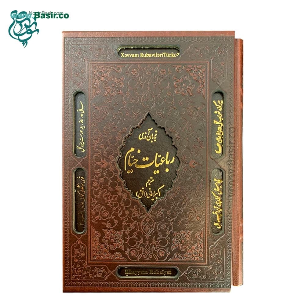 کتاب رباعیات خیام نفیس همراه با قاب کشویی طرح لیزری بصیر، متن نستعلیق به همراه ترجمه ترکی آذری، انگلیسی و ....