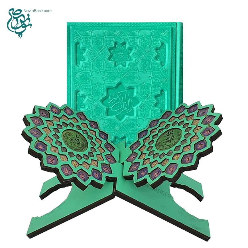 کتاب قرآن لبه رنگی جلد برجسته سبز همراه با رحل نفیس