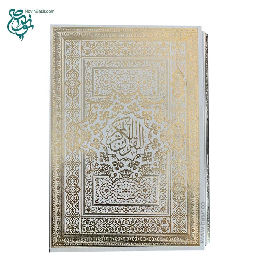 کتاب نفیس قرآن سفید گالینگور همراه با قاب کشویی با دفترچه