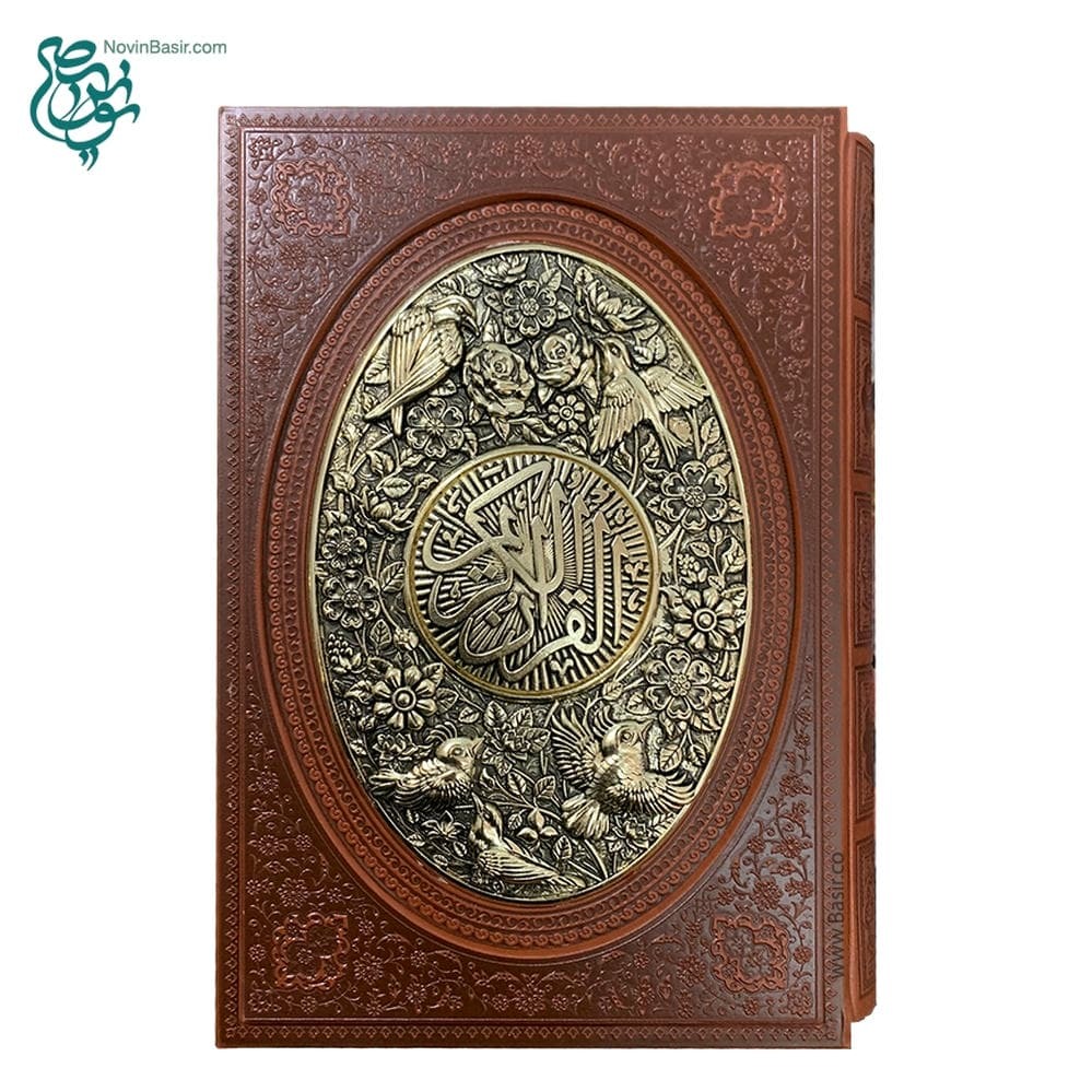 کتاب قرآن نفیس طرح چرمی همراه با قاب کشویی زیبا طرح مس