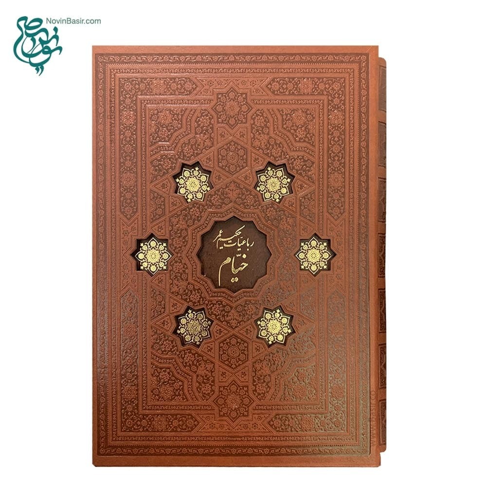 کتاب نفیس رباعیات خیام در قطع وزیری همراه با قاب کشویی چرمی لیزری