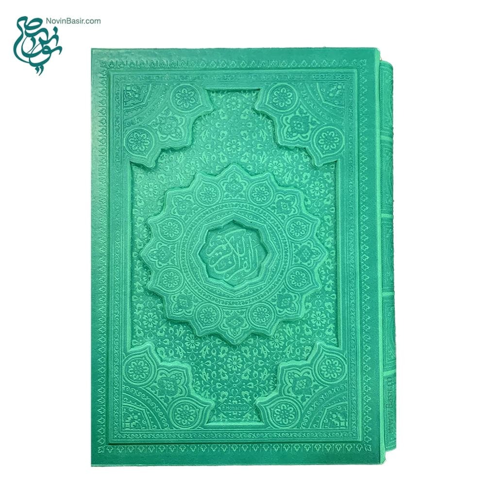 کتاب نفیس قرآن جلد رنگی لبه رنگی همراه با قاب کشویی برجسته