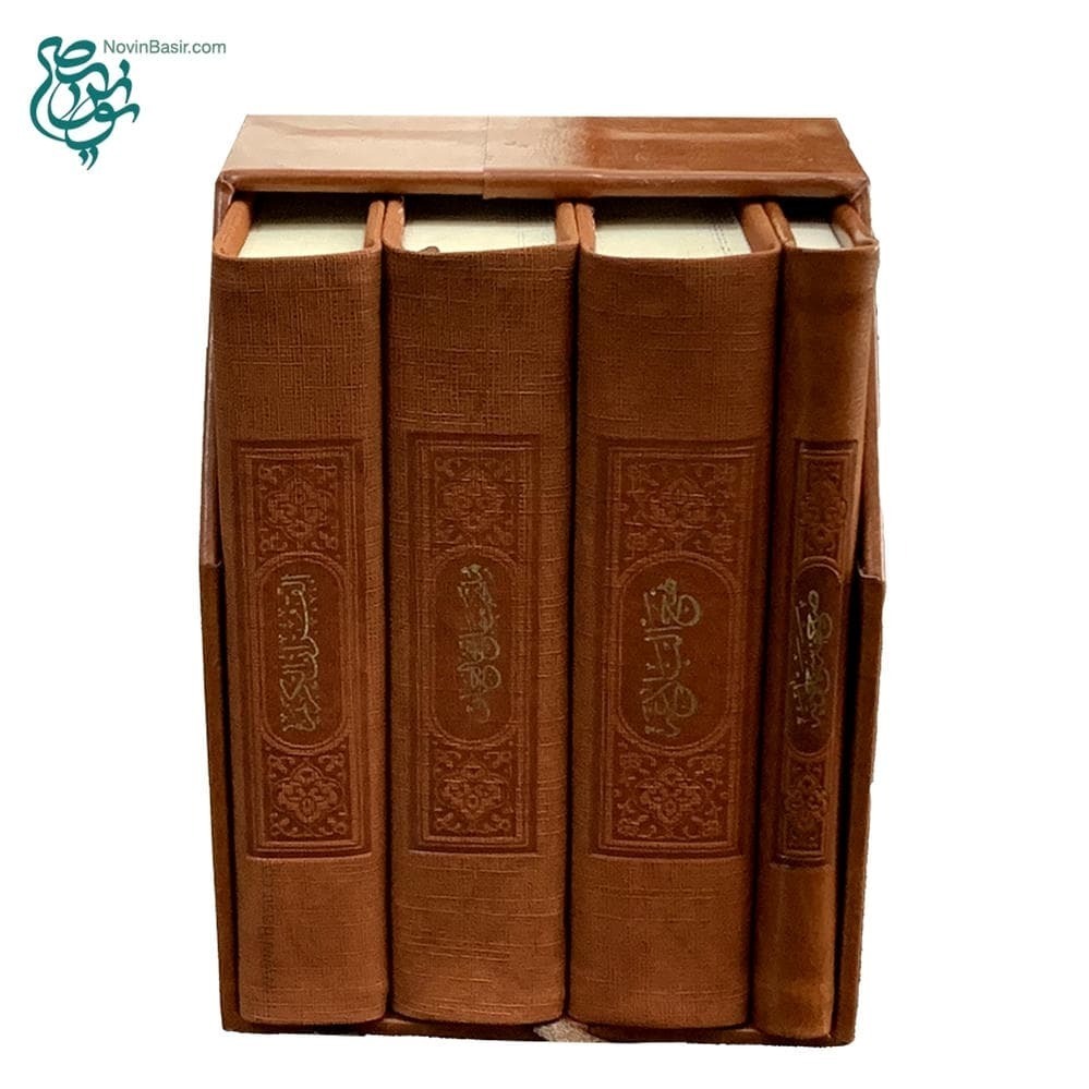 مجموعه 4 جلدی نفیس در اندازه پالتویی شامل قرآن کریم نفیس، منتخب مفاتیح الجنان، صحیفه سجادیه و نهج البلاغه همراه با جلد چرمی (ترمو) داخل قاب چرمی زیبا.