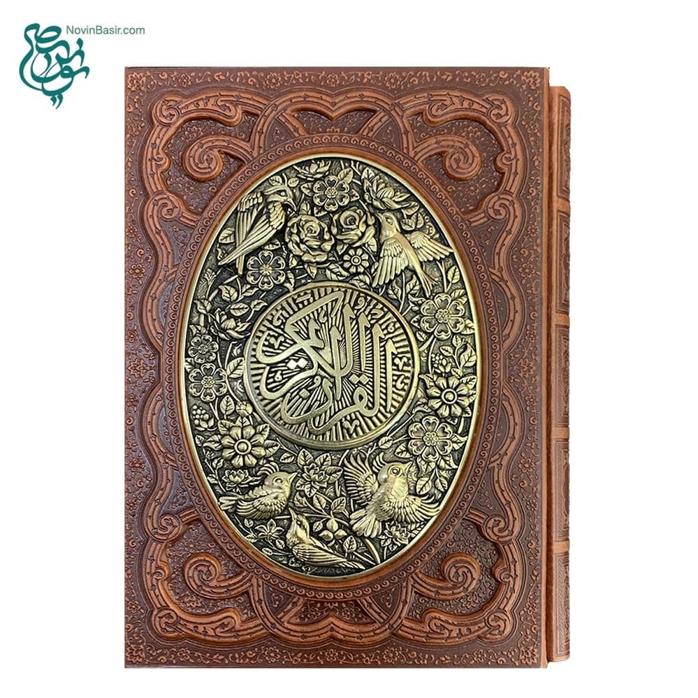 کتاب نفیس قرآن طرح چرم و مس همراه با قاب کشویی