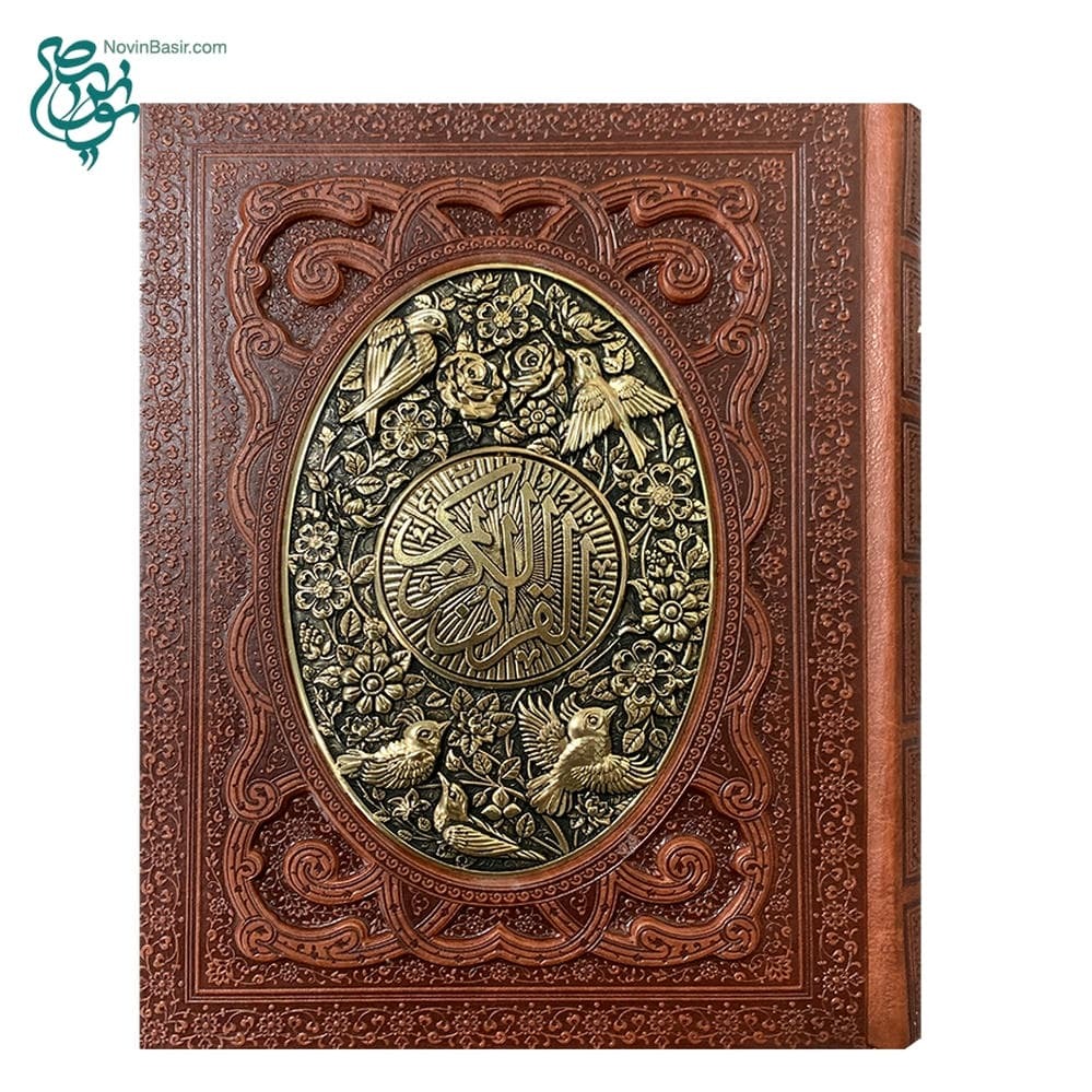 کتاب نفیس قرآن کریم همراه با جعبه صندوقی (قاب بازشو) طرح چرم که با لوح مسی بر روی جلد و قاب با طراحی بسیار زیبا مورد توجه و استقبال بیشتر هموطنان عزیز قرار گرفته است. این کتاب نفیس دارای تذهیب زیبا همراه با کاغذ گلاسه و چاپ کاملا رنگی زیبا در قطع وزیری می باشد که توسط انتشارات نوین بصیر با تخفیف های عالی در سراسر ایران توزیع می گردد.