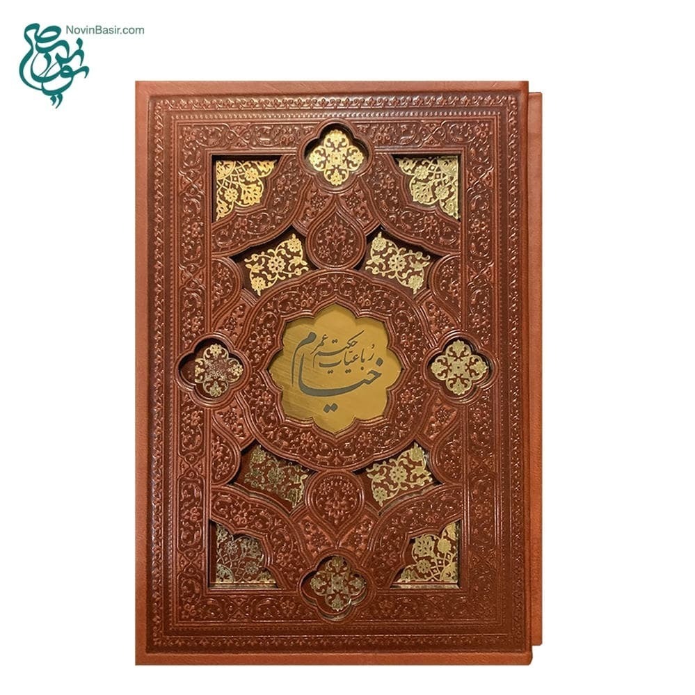 کتاب رباعیات خیام نفیس چرمی لیزری همراه با قاب کشویی قطع جیبی
