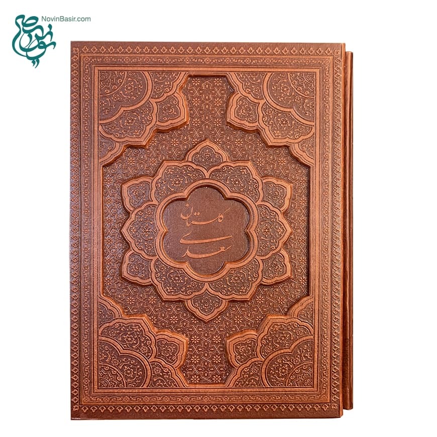 کتاب نفیس گلستان سعدی چرمی برجسته همراه با قاب کشویی در قطع وزیری با کاغذ گلاسه و تذهیب زیبا و قیمت مناسب به صورت عمده تک فروشی توزیع میگردد.