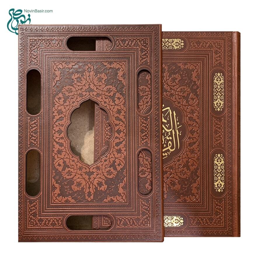 کتاب نفیس قرآن کریم همراه با قاب کشویی چرمی (ترمو) لیزری