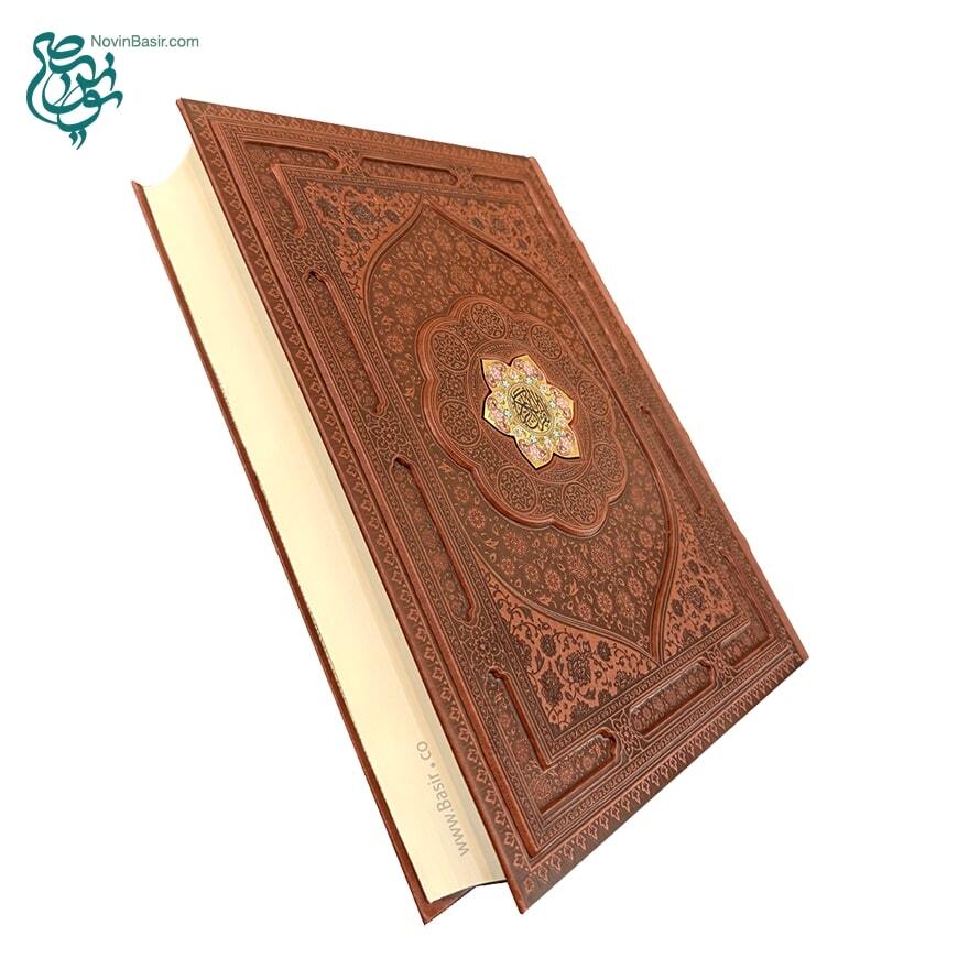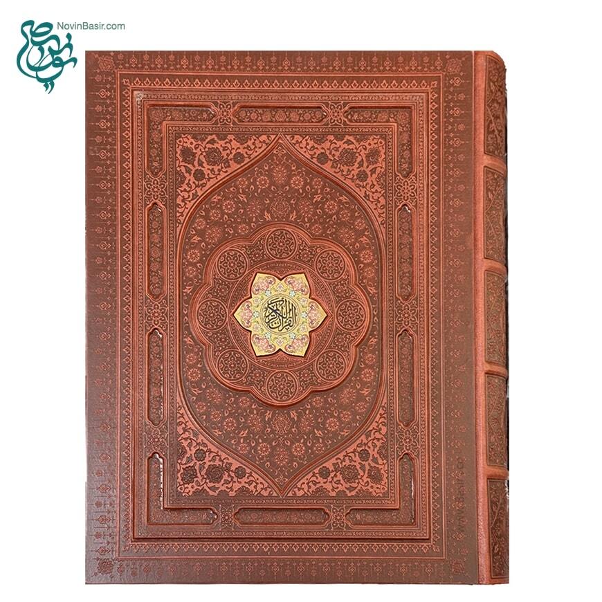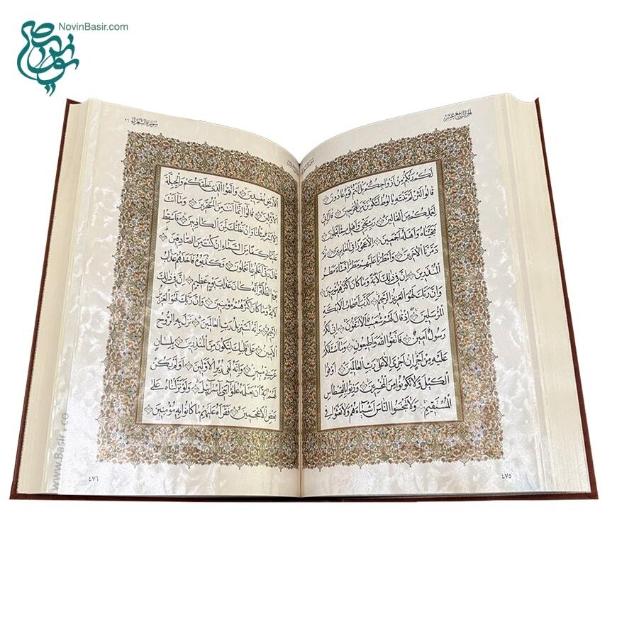 کتاب قرآن بسیار نفیس جلد چرمی (ترمو) همراه با قاب بازشو چرمی طرح برجسته با خط بسیار زیبای ساتاد نیریزی و بدون ترجمه فارسی در قطع بزرگ رحلی که به صورت تک و یا در تعداد بالا توسط موسسه فرهنگی و قرآنی بصیر (انتشارات نوین بصیر) در داخل و خارج از کشور توزیع می گردد.