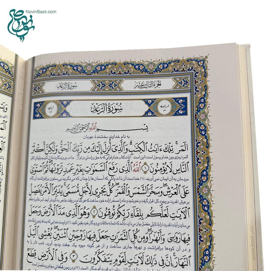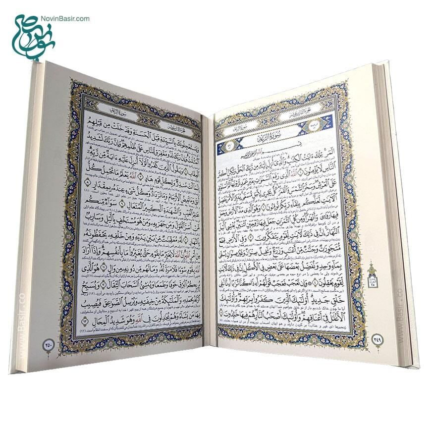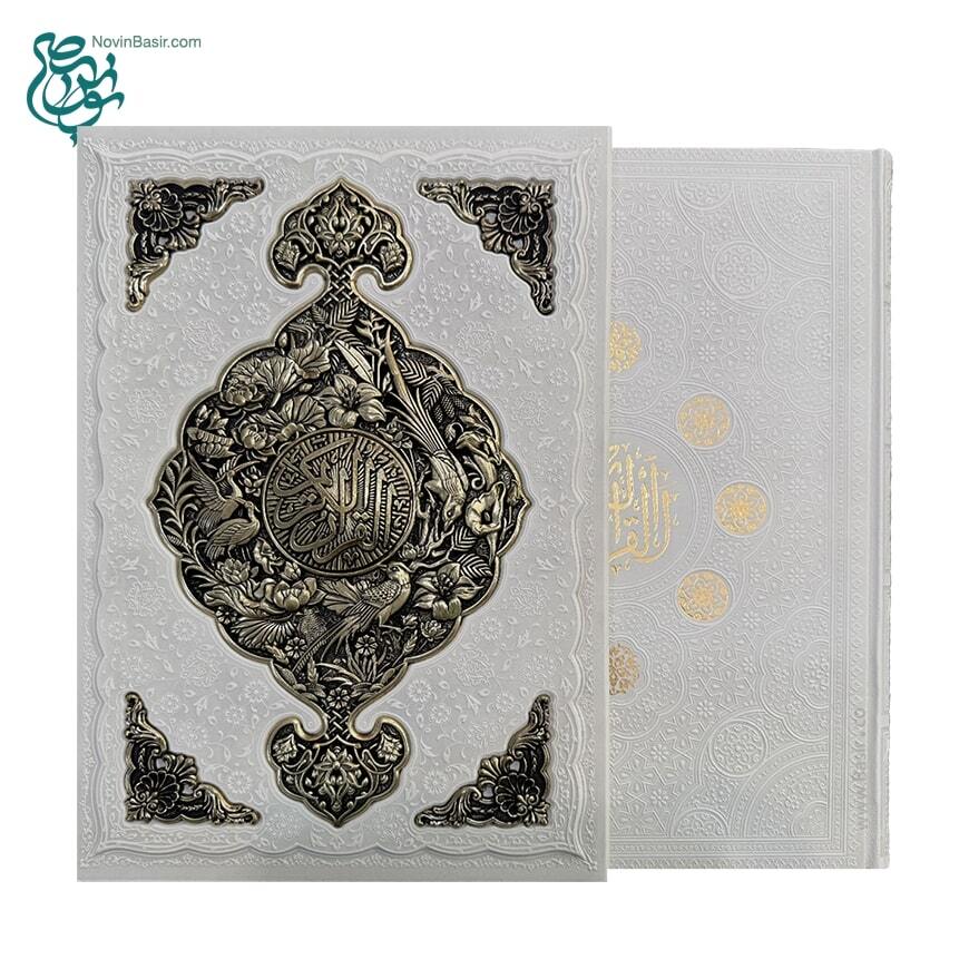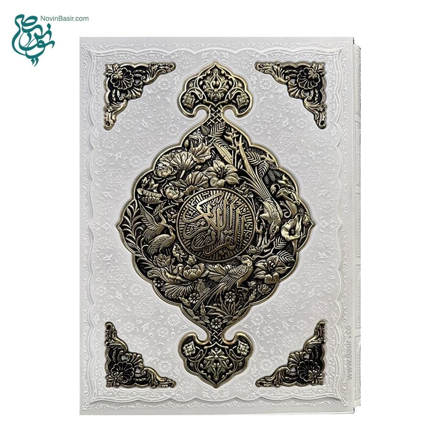 کتاب زیبای قرآن نفیس سفید طرح مس و طلاکوب در قطع بزرگ رحلی با چاپ کاملا رنگی و زیبا با کاغذ گلاسه و همراه با قاب کشویی که با تخفیف های بسیار عالی در سراسر ایران توزیع می گردد.