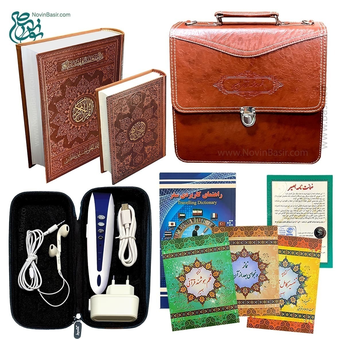 کامل ترین و آخرین بسته قلم قرآنی بصیر با امکانات عالی و بی نظیر که به صورت ویژه توسط این مرکز عرضه می گردد .این بسته همراه با قرآن وزیری بسیار درشت خط (1208 صفحه ای و درشت خط ترین کتاب ویژه قلم هوشمند قرآنی) دارای ترجمه فارسی زیر، کتاب منتخب مفاتیح درشت خط، دفترچه های گوناگون و کاملترین امکانات همراه با کیف طرح چرم با قلم هوشمند با کیفیت بسیار عالی و قابلیت به روز رسانی و با قابلیت استفاده از جدیدترین کتاب های تولید شده توسط موسسه بصیر گامی جدید در نسل قلم های هوشمند نهاد. این بسته از هر لحاظ مورد تائید شرکت بصیر است و نسبت به بسته های مشابه دارای کیفیت و امکانات عالی و بی نظیر است که توسط این موسسه با قیمتی مناسب و پشتیبانی عالی توزیع می گردد. همچنین مجوز سازمان دارالقرآن جمهوری اسلامی ایران در انتهای کتاب قرآن این بسته چاپ شده و قلم قرآنی دارای کیفیت عالی با یک سال گارانتی تعویض و سه سال خدمات پس از فروش می باشد.